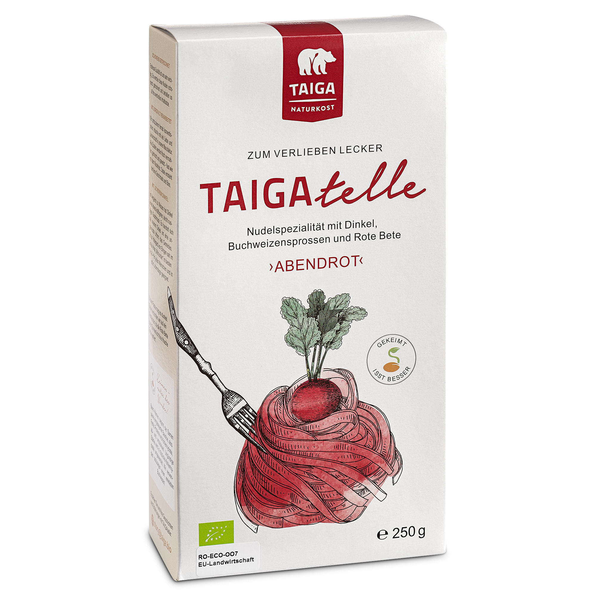 Leckere Tagliatelle „TAIGAtelle Abendrot“, aus angekeimtem Buchweizen und Dinkel. Für die wunderbare und außergewöhnliche Farbe sorgt Rote Beete.